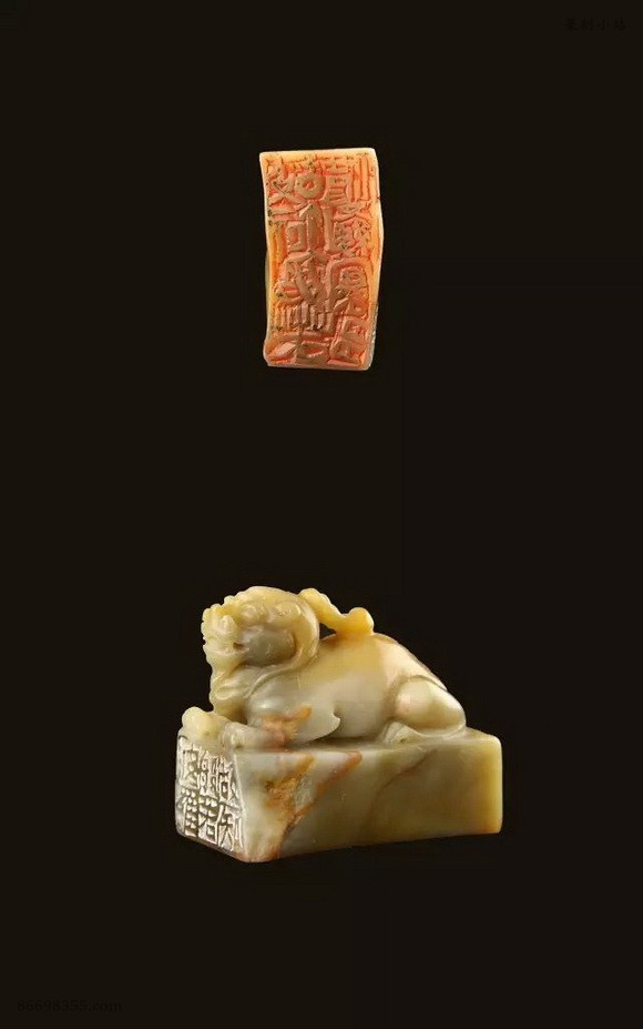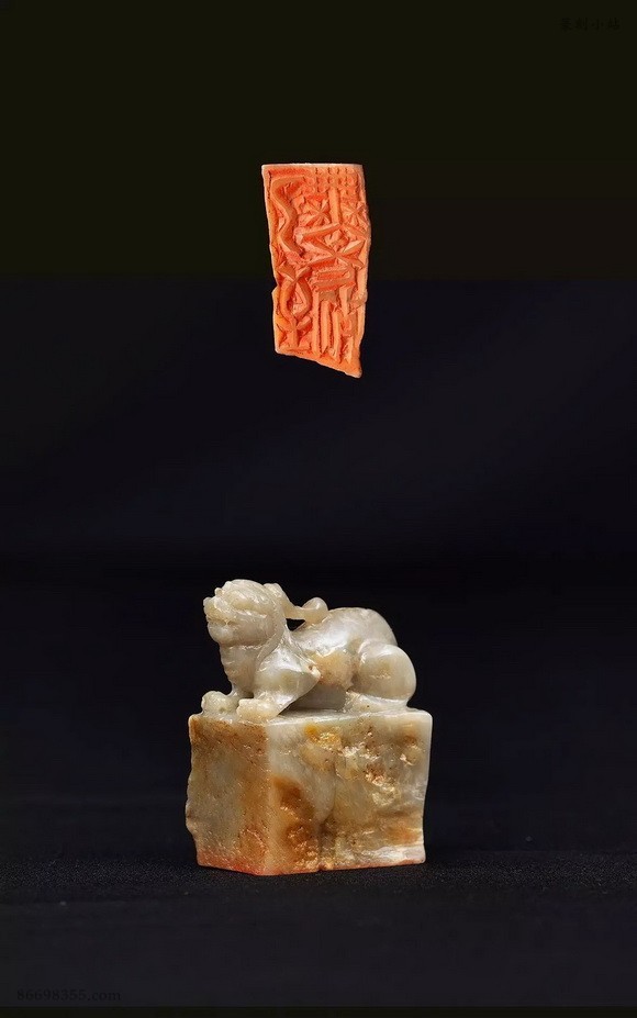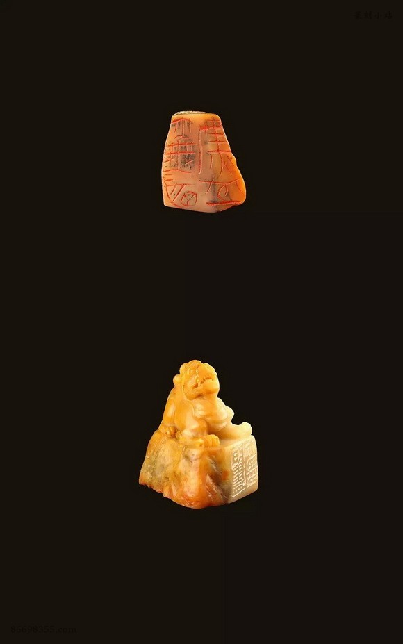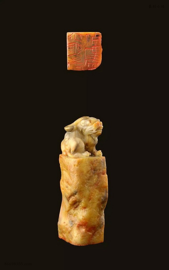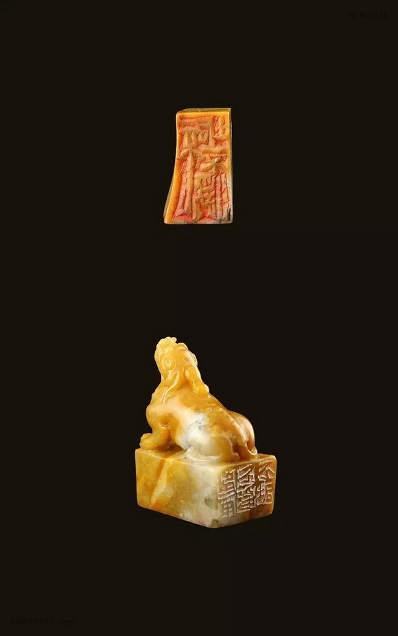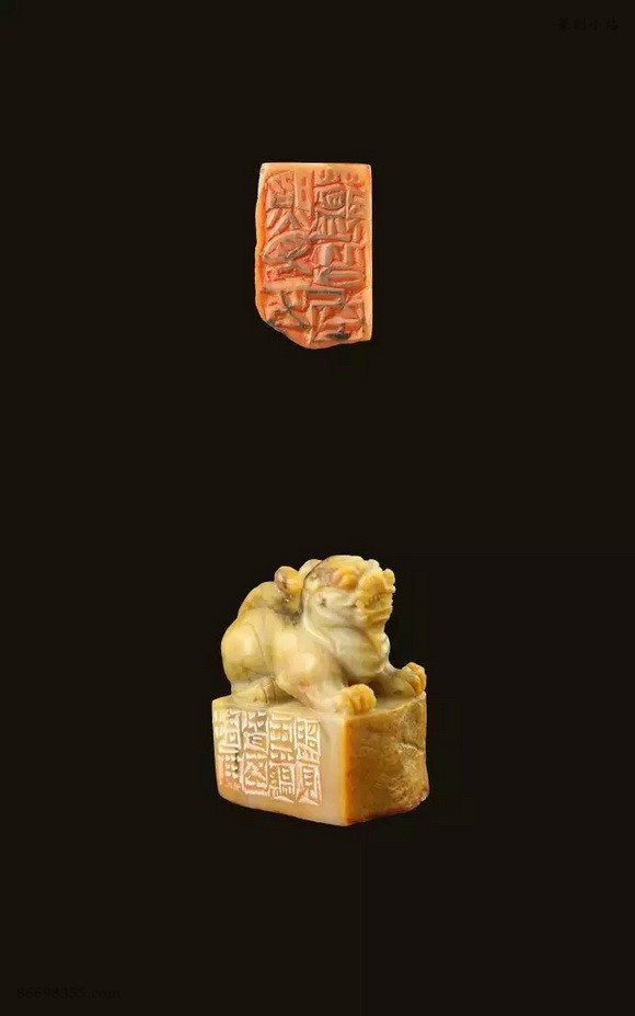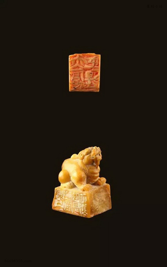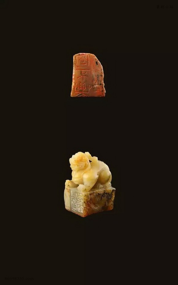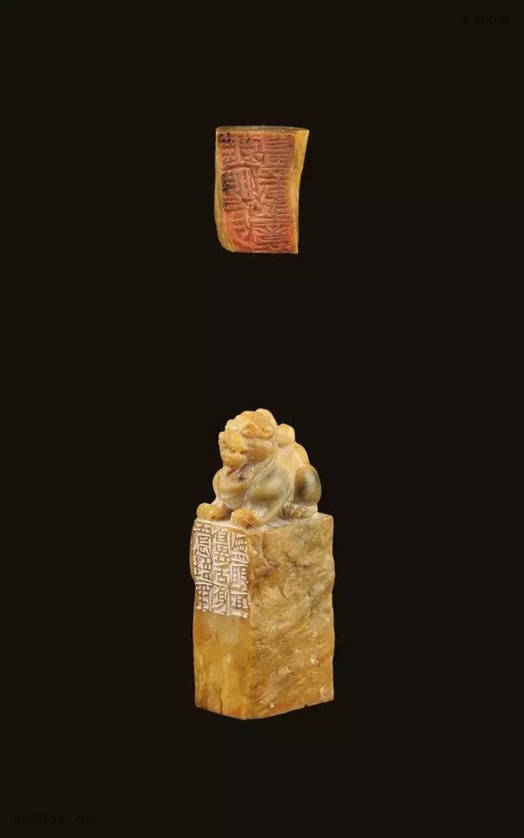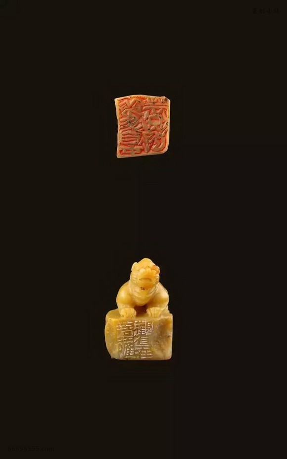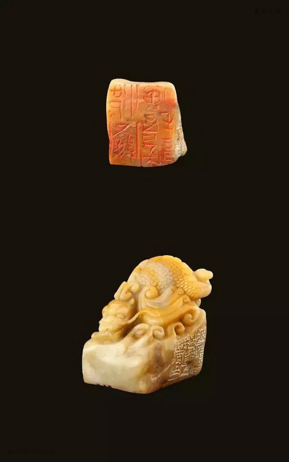 这是篆刻小站五年前在某展上看到的朱培尔在异形昌化石上所创作的一套以心经为内容的作品。刻异形印很难免俗,但他做到了。但这组印的奇妙,还是在于其中的刀法。朱培尔的刀法,用的是前人所不多见的一种最有利于揭示刀法本真的姿态。尤其是他的冲刀,会用的非常感性,可以自由随机的变化,会因为刀的不同、石头甚至石质的不同,随意、随机,自然、放纵地去运转刀的角度、速度、力度,甚至刻的深度,努力使刀法成为一种连续的、刀刀生发的、反映性情和情绪的有机表达,使运刀的节奏成为一种有机的律动。