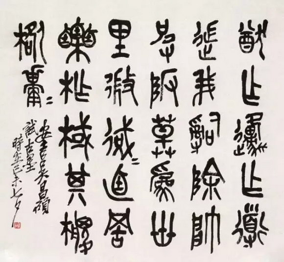 1.吴昌硕(1884-1927)浙江安吉人,名俊、俊卿,原字仓石,中年后更字昌硕,七十岁后以字行,别号老缶。吴昌硕的书法以石鼓文为绝,其石鼓文融合篆刻用笔,凝炼遒劲,貌拙气酣,极富金石气息。其行书融进了清代大家王铎的风格。吴昌硕著有《缶庐集》《缶庐印存》等。