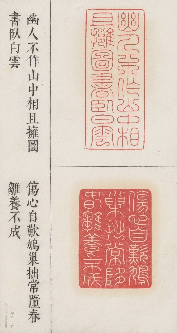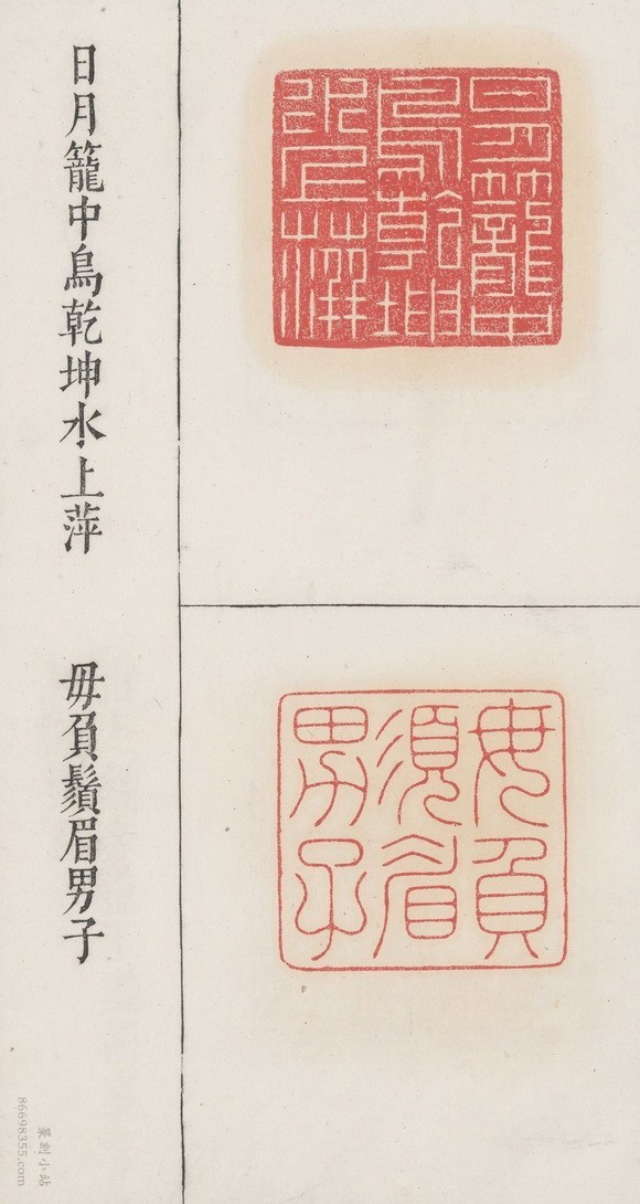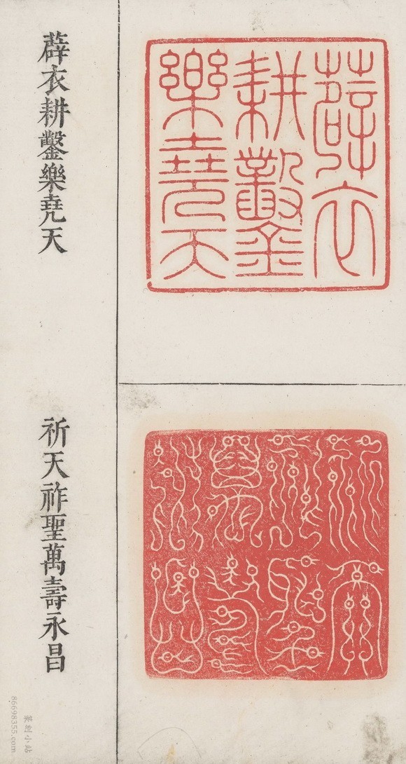 但张灏自道”余幽严绝俗之性,如病猿惊鹤,与世难驯,居恒抱影顾循,方以古人治性之道为愧,而无如处遇艰辛,遭家多故,遂令志意蕴愤,慷慨悲切”,满腔块垒”终宛舌而固声”,无以寄托,于是”取古今人微言隽句”,遍邀当世名手刻制成章,蕴警世喻人之意,又取自己宏富的印章收藏,辑拓成谱。