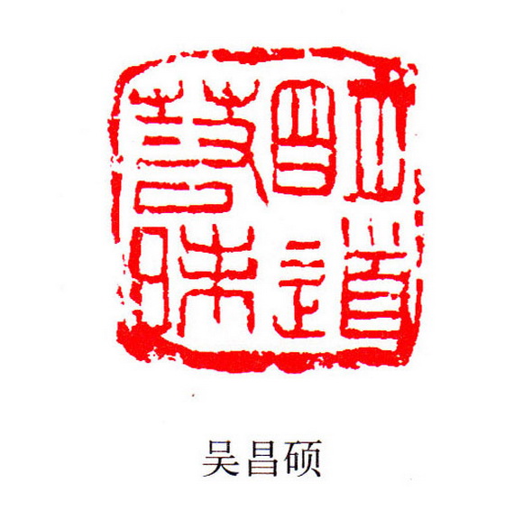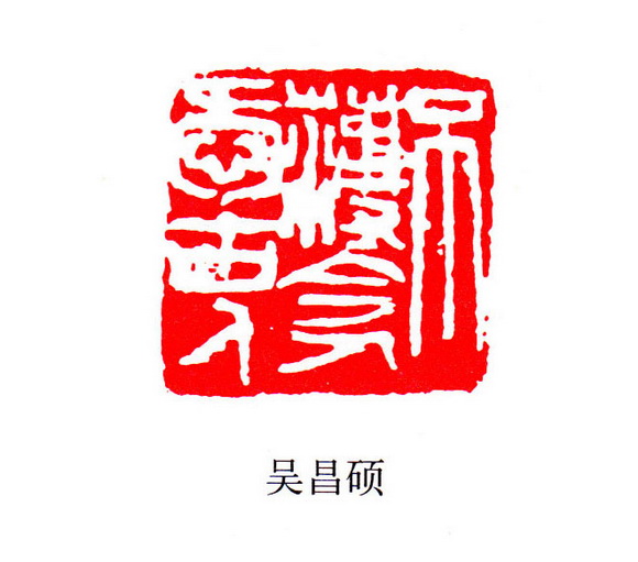 吴昌硕刻。吴昌硕,晚清民国时期著名国画家、书法家、篆刻家,“后海派”代表,杭州西泠印社首任社长,吴昌硕篆刻从“浙派”入手,后专攻汉印,也受邓石如、吴让之、赵之谦等人影响,善于留白,或对角欹斜,气象峥嵘,构图块面体积感极强。刀融于笔,篆刻雄而媚、拙而朴、丑而美、古而今、变而正。上取鼎彝,下挹秦汉,以“出锋钝角”的刻刀,将钱松、吴攘之切、冲两种刀法相结合治印。