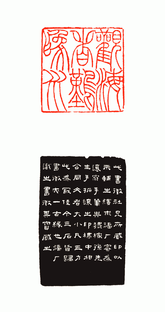 邓石如元朱文最具代表意义的作品,篆法上他纯以自家“邓篆”书风入印,意趣洒脱,压缩了小篆的长宽比,使纵长的小篆转化为类似缪篆的方正式样。用刀上以长冲为主,刀留涩意,线条圆润流走,酣畅纵横,雄浑奔放。章法上也以自己的章法主张作调整安排。