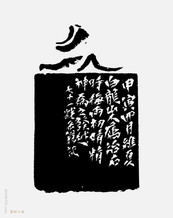 1914年,71岁,甲寅四月维夏,白龙山人属治石,时梅雨初晴,精神爲之发越,七十一岁缶翁记。