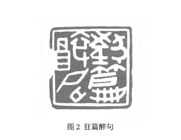 书法初学徐浩、虞世南,秀逸清淳,寓刚于柔,深为同道所推重。其性格高傲孤芳,酩酊放歌,酒酣纵议,又刚正不阿,好打抱不平,与其印“狂篇醉句”(图2)如出一辙,为人与众不同,影响到篆刻上(又有依托其书法秀逸清淳,清刚绝俗的一面),喜好古玺闲章,即有觑幽刺怪、奇招横生的面貌。