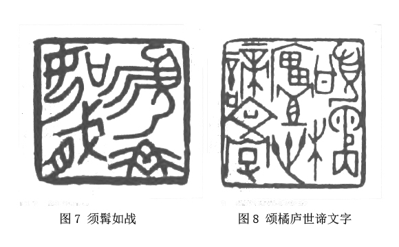 1.注重几何图形的穿插“颂橘庐世谛文字”(图8)中的三角形、半圆形、小方块的错落有致使印面如京剧舞台大。结局的亮相,奇趣妙生。又如“曾克蛹”(图3)一印,既有文字的笔墨韵味,三字如三个不同的人,一如小丑,一如老翁,一如仕女,形态各异,生动可爱,加上刀法与字法的反差,妙趣横生。