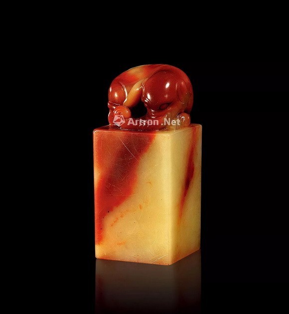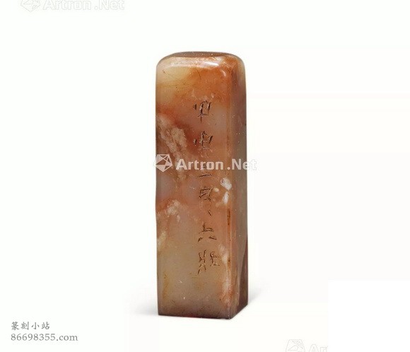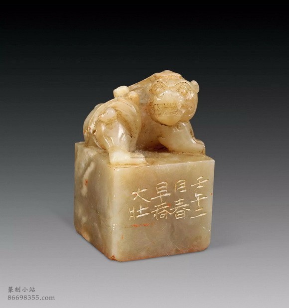 说明:晚清黄牧甫印风风靡一时,流风不绝,尤在南国影响更大。乔大壮学黄而能参以古玺、封泥的风格,以其性格之豪迈而形成自己的印风。印文“会心不远”,边款“状刻”。此印实小篆印文的大篆化排布,篆法巧拙互见,布局变形中见互相配合处,妥帖安详,疏密合度,古拙隽雅,凝练爽峻,诚为合作。材属寿山上洞红花芙蓉冻石,质滑温润,牡丹红色块娇艳明丽,光彩四射。钮雕卧象,圆润精致,神来奕奕,造形优雅,琢工精湛,不露刀锋棱角。寿山上洞红花芙蓉冻石,质滑温润。钮雕卧象,圆润精致,不露刀锋棱角。此印实小篆印文的大篆化排布,篆法巧拙互见,布局变形中见互相配合处。