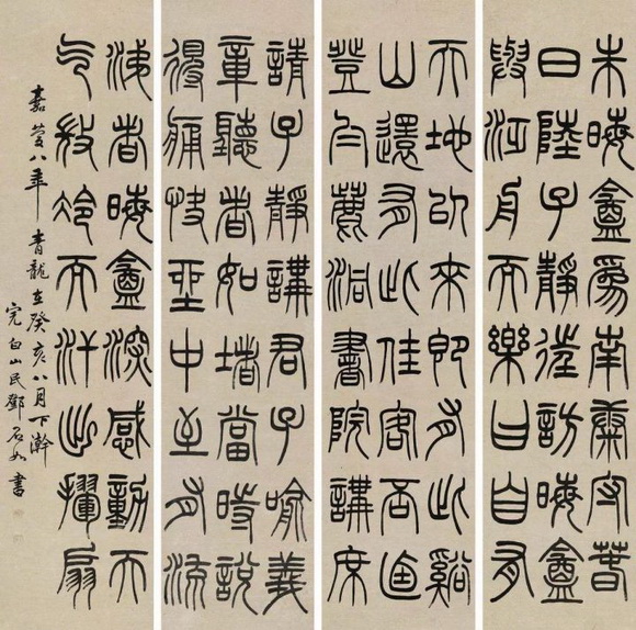 邓石如为清代碑学书家巨擘。他以隶法作篆,突破了千年来玉筯篆的樊篱,为清代篆书开辟了一个新天地。