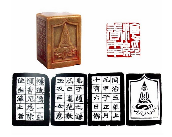1:佛像印:在佛像印的创作中,佛是最广泛的创作题材之一,占有相当大的比例。佛教的创始人是释迦牟尼,出生在现尼泊尔境内的古迦毗罗卫国,名字叫乔达摩悉达多。二十九岁出家,苦修六年,在菩提树下悟道成佛。佛是“觉者”、“智者”之意。释迦牟尼是佛教徒对他的尊称,意为释迦族的圣人。在这里主要是指以释迦牟尼为主尊创作的佛像印,也包括三界十方诸佛在内的的一切佛像印。广义的佛像印除了上述佛的造像外,还包括菩萨、罗汉、护法、诸天神将在内的一切佛教造像。