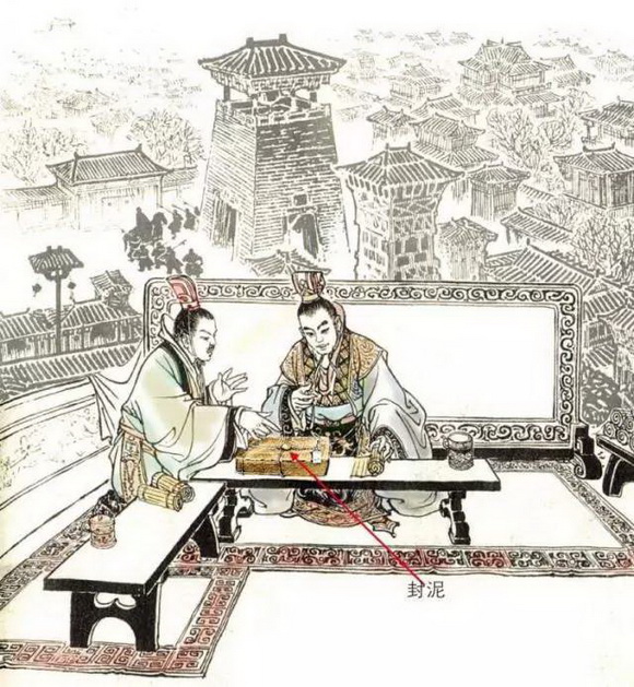 秦始皇统一中国后,大建咸阳宫,其中一处名章台,秦始皇曾在这里“躬操文墨,昼断狱,夜理书”。于是,中央各公卿机关、全国各郡县的奏章便向这里源源汇集。一本奏章就是一捆竹简,作为当时的一种保密措施,上奏官员要将竹简捆好,并糊上泥团,再在泥上钤上自己的玺印,然后放在火上烧烤,促其干硬。奏章被送到章台,值守吏要呈送秦始皇亲自验查,封泥完好,确未被奸人私拆偷阅,才敲掉泥封壳御览。