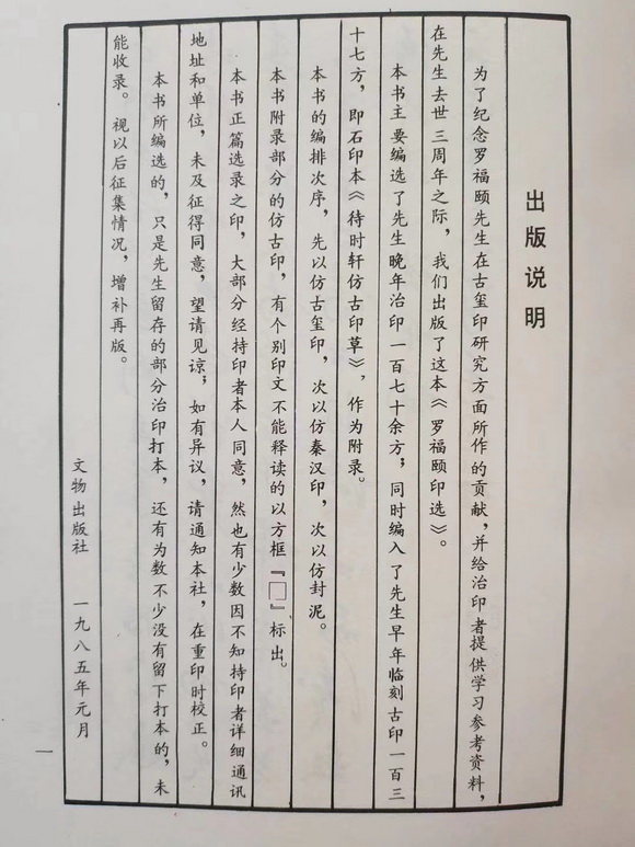 先生于一九八二年十一月八日谢世于北京,终年七十六岁。这次刊印这本印选以表对先生的怀念。印册集成,曾呈先生寓目赐跋。又蒙马国权、饶宗颐、荣毅仁、启功、周策纵、徐邦达、冯牧诸先生题跋,沙孟海先生题签,在此并表谢忱。