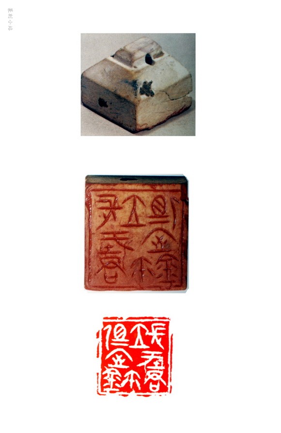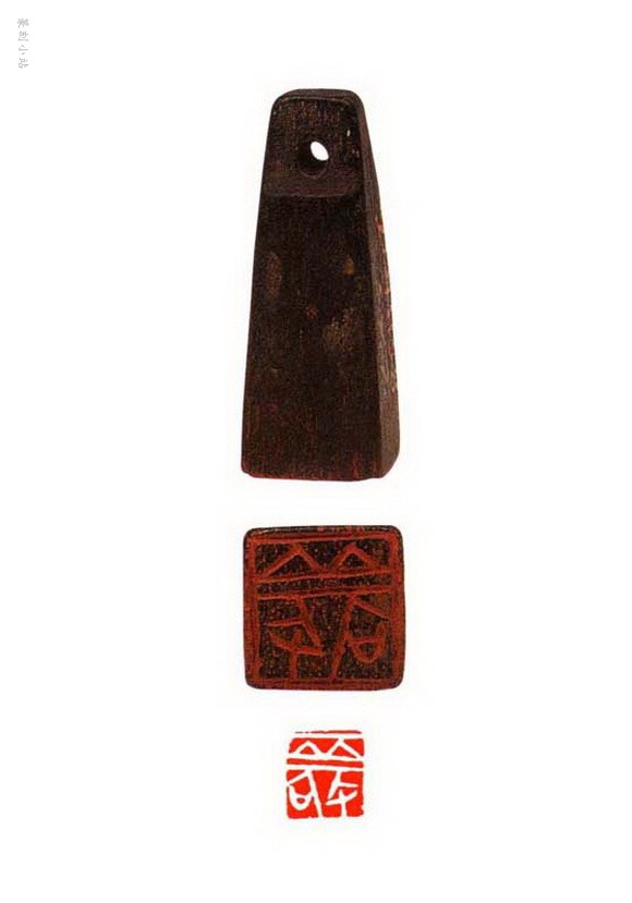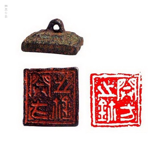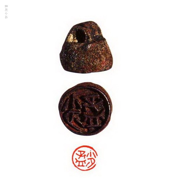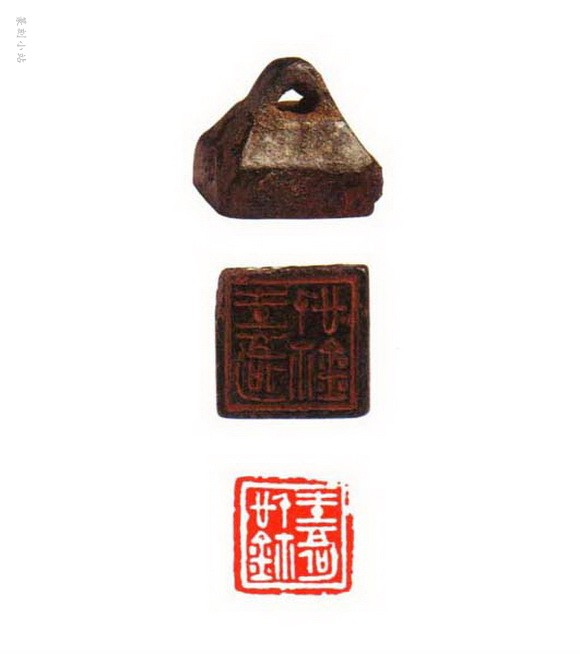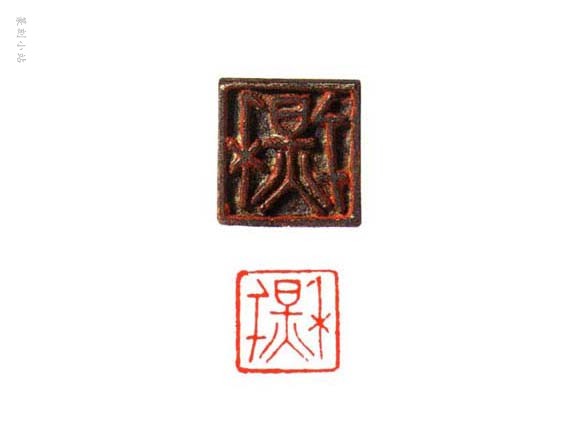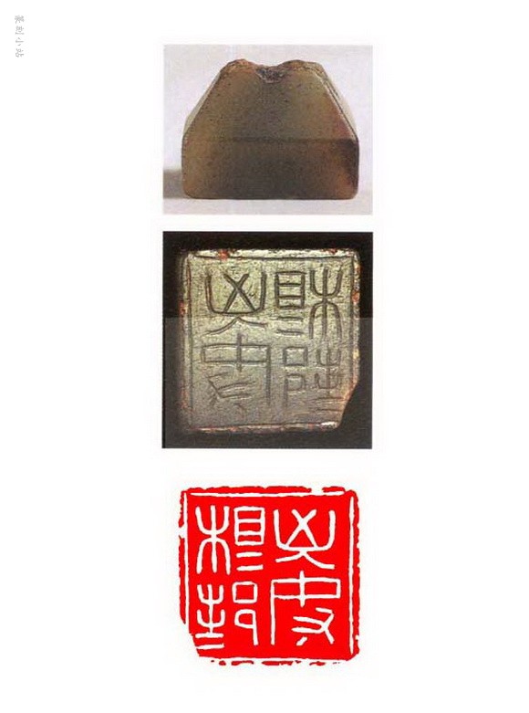 这是一方战国齐系姓名玺,造型十分有趣,布局也打破了传统四字印的章法。“王”和“信”字较小,因为笔画少,“王”还在两横下面加了一个圆点,与“信”字右边的圆点起到了同样的作用,添补了空白,又避免了空间分割的过于单调。“倚”字把“亻”移到下边,把“大”移置上方,变为上下结构的字,与左右结构的“玺”字刚好错开。“玺”字左重右轻,“金”的四个点也有所变化,各不相同。此印下部较密,上部的留红比较多,疏密有致,方圆结合,堪称玺印中的精品。