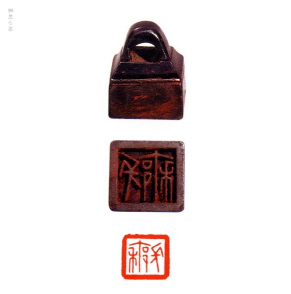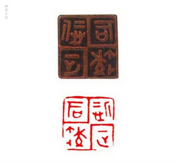 此印为战国吉语私玺。此方玺印的章法布局十分新颖,为了匡正文字而在对角加框,显得十分活泼。对角加框的动机是为了使笔画较少的“正”、“司”二字不显单薄,如果用十字界格则此效果全无。“司”字加框之后,字移居左上部,空出右下角,并以上实下虚的线形,形成向右俯瞰之势。“正”字上框线左低右高,使“ 悊 ”字有机会向左倾斜,与“敬”字相呼应。此印还有一个比较大的特点就是文字比较抽象、简练,给人一种空灵之意境。
