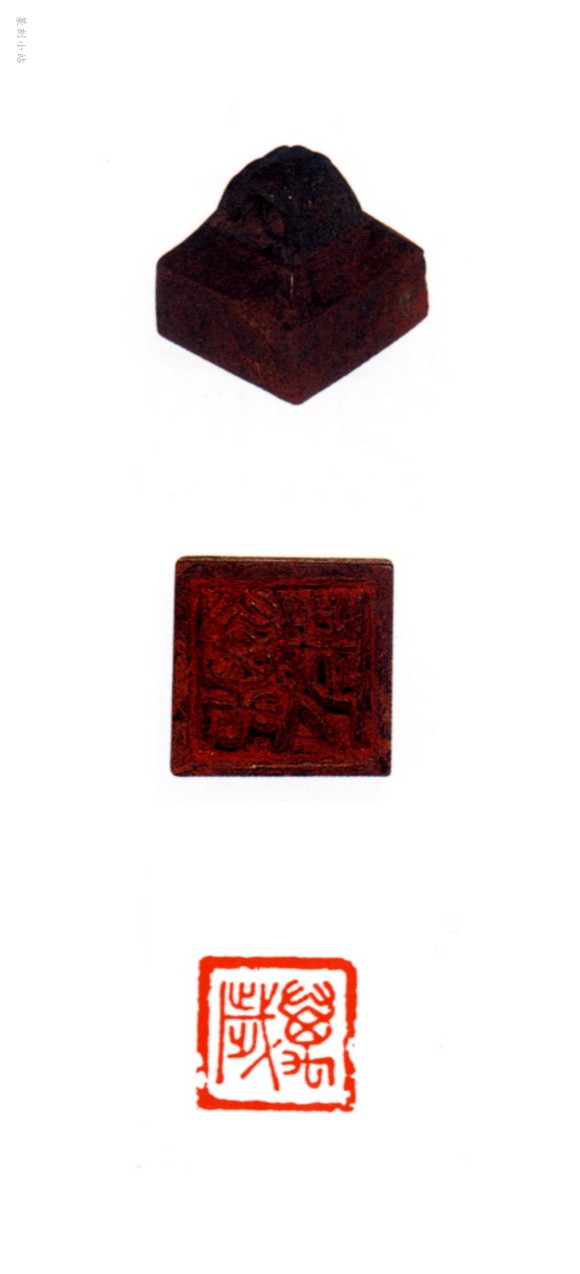 这是一方战国晋系私玺。此印虽然是三个字,但却是按照两个字来布局的。“上官”二字连在一起,与“黑”字一起平均分配了印面。“上”字刻得平稳工整,“官”字用“ 宀 ”撑起了“上”字,“官”字的“ 宀 ”左边长,右边稍短一些,下面的部件向右倾斜,故意留出了右下角的一点空间。“黑”字比较端正,左右基本对称,但也存在着细小的变化,“黑”字下的“火”字左点短,右点长,中间两笔也是左长右短,刚好错落开来。此印下部留的空间比较多,边框的残破也增添了这方印的生动感。
