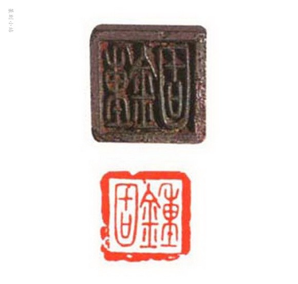 此方玺印注意粗细变化,“登”字的“ 癶 ”刻的很重,对称却不相同,左边略大,右边稍小,下部虽然笔画较细,但细中也有细微的变化。整体来看,“登”字用圆笔较多,“画”字则用直线较多。“画”字用了很长的一个折笔竖把两个字分开,“登”字零散的部件多,而“画”字的这一长笔则把它变成了一个整体,否则这两个字在一起将会显得过散。