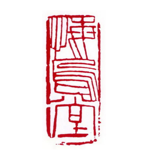 此印为一方白文印,印文分为左右两行,但并不是按照字数平均分配,而是根据笔画的多少进行安排,右边有六个字,这六个字的字形处理都比较扁平,但整体却十分和谐自然,。此方印的章法取古玺左右逼边的意趣,中间留红显得十分自然生动。此方印的左右两边各有冲刀,边线内陷,造成一些笔划与印边相通,使得整方印古朴自然,富有变化。
