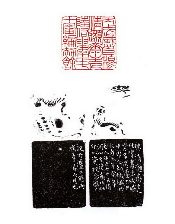 此印为一方朱文印。印章的形状是椭圆形,所以字的结体取势也随形而变。“墨”字的上半部分的处理就与印章的形状相吻合,而下半部分的笔划也随着印面的加宽向两边伸展。“戏”字的线条粗细比较均匀,在造型上却包含了方圆尖的变化。边框的线条比印文要粗一些,比较均匀。边款以楷书入印,章法上有行距而无字距,富于变化,整体的安排比较靠上,下半部分留有大量的空白。