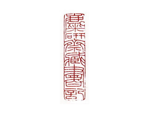 这是一方多字白文印。 此印拟古玺印,用笔刚劲挺拔,光洁爽利,结字章法随行布势,一任天然,阔笔的应用打破印面的均整,增强印面视觉冲击力。在相同字的字或相同笔划的处理上各具特色,如两个“十”字的造型完全不同,又如“三”字,三个相同的横划形态各异,“窄”字左右两边的竖划长短和形态各不相同,左边款稍微粗一些,这些细小之处的变化给整体比较端庄的字形增加了一丝流动感。