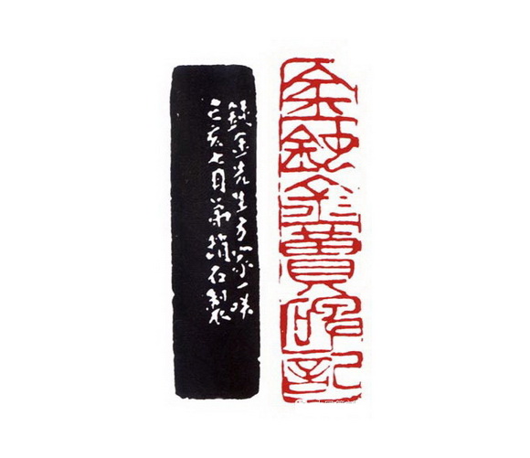 此印六个字竖排排列,线条的粗细不均、方圆结合。两个“金”字处理很巧。在字形的选择上有差异,第一个“金”字以尖细的笔划为主,第二个“金”字则比较圆转。“钝”字左右两边均等,线条以圆转为主。边框处理也很特别,右上角和右边框的线条几乎缺失。