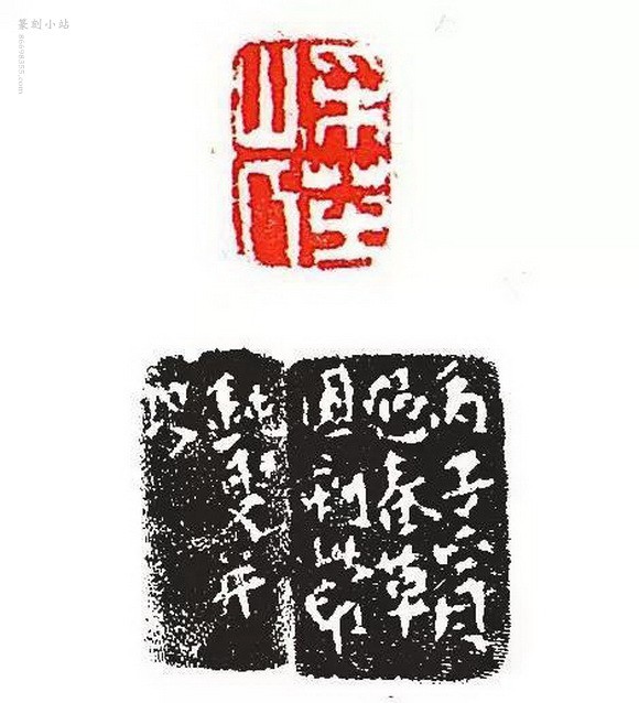 篆刻古拗峭折直追秦汉,力挽清初印坛娇媚之失;边款不用书写,以刀直下,尤为前人所未有,海内奉为圭臬。常往来于杭州、扬州间,与金农、汪启淑、明中等交往甚契,金冬心的许多自用印便出自其手。此枚“采芝山人”白文小印以缪篆入印,以切刀为之,钝朴奇崛而不迟涩,干净利落而不轻巧,在古朴的气息中透出一种轻松的味道,大家手笔,不同凡响。边款单刀刻“丙子正月过春草园刻此印,钝叟并记”,丙子年为1756年,乾隆二十一年,这年丁敬61岁,艺术已臻化境。丁敬传世作品市场上稀若晨星,此枚印章曾收录于《西泠八家印选》和《丁丑劫余印存》中,传承有序,堪称杰作。