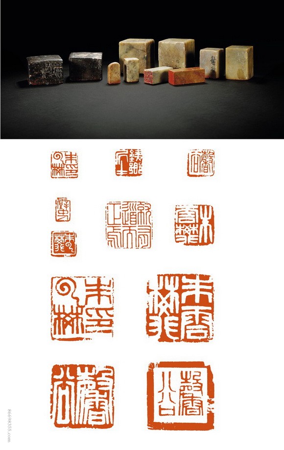 边款:1.二十年处暑后三日为馨谷仁兄作,粪翁。 2.粪翁仿汉。 3.二十五年白露后三日为馨谷仁兄刻,粪翁。 4.粪翁。 6.粪翁。 10.三十六年夏,馨谷自制。