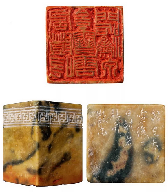 此印取之《晋书·阮籍传》:“嗜酒能啸,善弹琴,当其得意,忽忘形骸。”印文“忽”字用了“曶”,避免了与“忘”字同为“心”字底的雷同。边栏两粗两细,粗细对角强烈反差,残边破损自然,显立体之感。