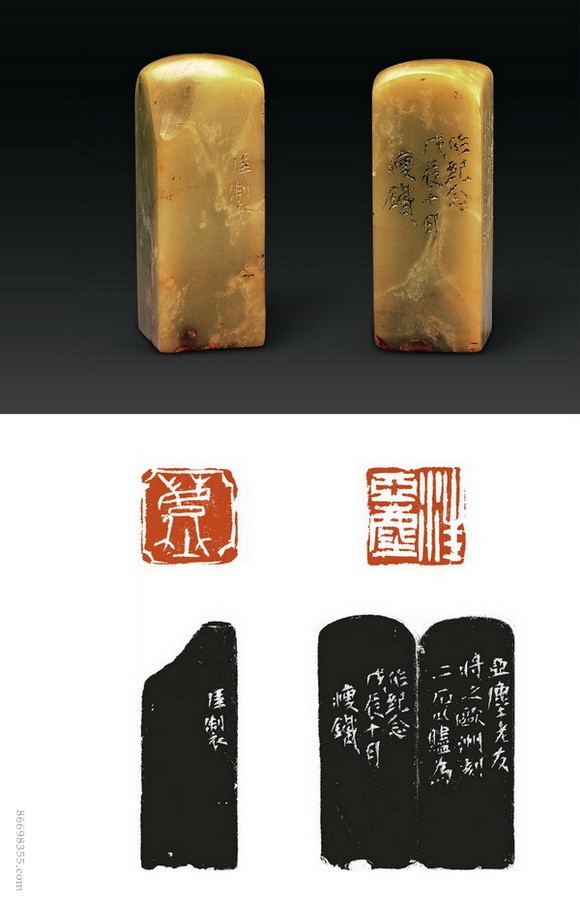 边款:1.厓制。 2.亚尘老友将之欧洲,刻二石以赆为作纪念,戊辰十月瘦铁。