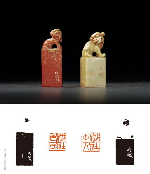 2914 钱瘦铁刻寿山、青田石古兽闲章二方