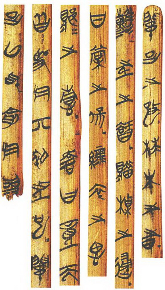 2.楚文字。由于楚地水网密布,地下水系发达,楚地墓葬往往完全浸泡在水中,因此保存了大量的简帛。竹简这东西,要么泡在水里隔绝空气,要么在西北大漠的干燥环境下还能保存下来,中原地区不干不湿,汉晋尚有发见,如今尽已朽烂,无从得见。所以现在看到的竹简,主要为楚简和汉简以及少量秦简,由于汉简不属于古文字材料,楚文字就成为当前战国文字研究中材料最为丰富的一系。楚人浪漫,有点像现在的法国人,所以楚文字简省较多,字形飘逸,在战国文字中独具特色。