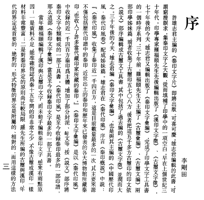 此书可谓穷搜瞑求,集秦印文字之大观,从而填补了印学中一项空白,秦印文字汇编以秦代印风中收录的近1400方秦印为主题,增加了部分封泥、陶文等,按《说文》部首将秦印恩子分类辑成的一部工具书。