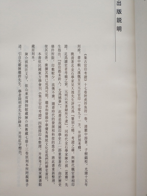 陈进先生为陈介祺七世孙,其承继家学,有感于《集古官印考证》存世刻本皆失载原印的情况,一一检索,从《十鐘山房印举》及其他印谱中辑得原印文而予以补订,诚为难得。