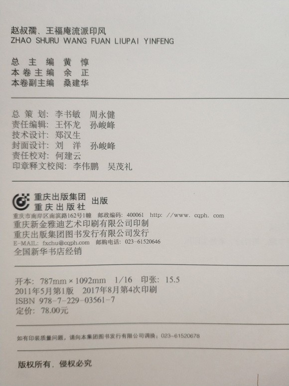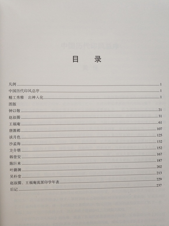 赵叔孺与王福庵流派印风,16开238页,定价78元,收赵叔孺、王福庵为主共11家篆刻作品共1758方,附边款677方。沙孟海、方介堪、陈巨来、叶潞渊系赵氏弟子,偏重于圆朱文;谈月色、韩登安、吴朴堂为王氏学生,钟以敬与唐源邺和王福庵交往甚深,印风相近,偏重于铁线篆。