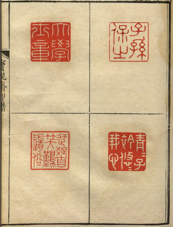 《宝砚斋印谱》由清初著名篆刻家林皋篆。全书共四册,是谱载林皋印作一百四十余方,每叶二至八印(无释文),多为姓名、字号、斋馆、文句印,钤拓精致。书前有钱陆灿、王掞、吴暻、周象明、徐乾学等人序文,并有林皋附记一则。书后有毛祐、许迎年、赵虹等人序跋。此为清康熙五十一年钤印本。