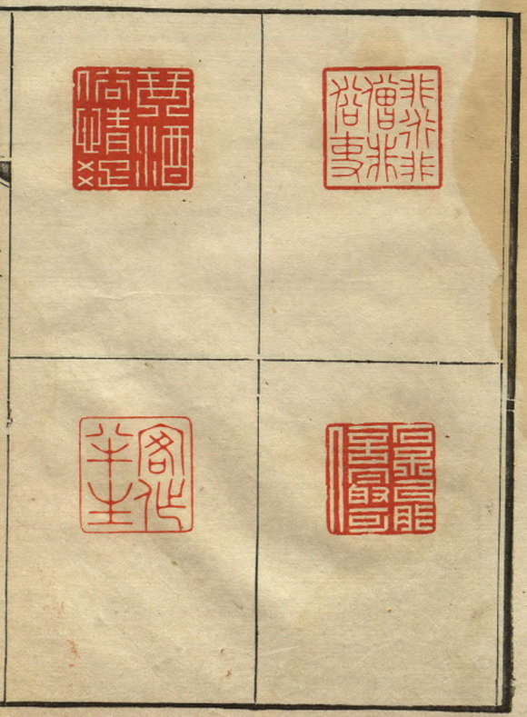 康熙癸丑钱陆灿序、林皋附记,钱朝鼎序、壬戌年王概序、壬戌年吴晋序、康熙壬戌周象明序、周斯盛序、戴绂序、王撰序、王掞序、徐乾学序、康熙甲戌吴暻序、王抑序、王掞再序、金砺序、方熊序、陈鹏年序、康熙壬辰孙翼飞序;印谱(每叶二至八印、无释文);甲戌毛祐跋、许迎年跋、赵虹跋;