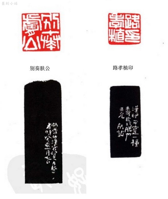 二是识古、研古、主动取舍的思想。陈师曾:篆刻根柢在汉印,研其取法汉印风格作品,绝不是单纯取形, 泥古不化,而是会心通神,用心独具。我们从其印章边 款中就可见其对汉印的理解非同一般:『按曲三郎』印 边款『汉官印有此错落之致』,『藤瓦精舍』印边款 『寓方于圆,汉人印法』,『杨昭儁之章』边款『汉鉴 印错落出奇,极可喜』,『灯下仿之』『路孝植印1』边 款『汉印平实一种,未可以巧胜也』,『別奏肤公』边 款『师曾仿汉印之方整者』,『与时浮沉』印边款『汉 印古趣不易到』等,这些也都是他的实践心得,也正表达出其对汉印审美风格多元化的深刻认识及明确的选择 取舍。