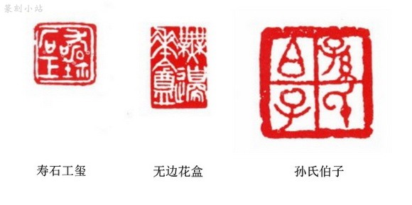 『上周秦』一语,见其取法古玺之志。在师曾印作中, 直接取法古玺风格或借鉴古玺章法形式的印作也相对较多,如为寿石工所作『寿石工玺』『无边花盒』『孙氏伯子』等,都属于这一类型的印作。且陈师曾不满足于三 代某地域之文字,许多诸侯国的文字都入其印而之中, 大大丰富了他的印章风格。