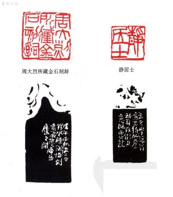 陈师曾边款采用切刀技法,大多行刀偏浅,稍带披削,然运刀稳健,笔势清楚。此种用刀加上方正字形, 给人以典雅淸俊的美感,怠境淡然,也有一隶书边款, 淸雅可人。另有几方印作边款特別,行刀率意果敢,结体开张,类其行书自然不羁之状。陈的印章边款可证明其创作的活跃期在三十五岁到四十八岁之间,虽然时间 不长,但其学习路径和学习方法能给后人以启示,即深研古印和前人印风,明确取法对象,取法乎上,而不盲从;檀集众美,更重融会;胆敢自立,却不自傲。