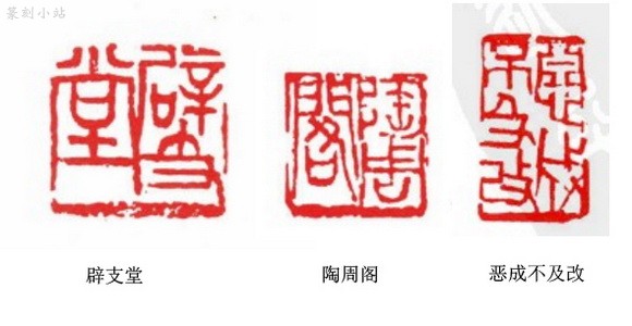 陈师曾说:『刻印当先书后刻,刻阴文当一刀为最佳,至多也不过两刀。刻阳文印则多为两刀。』第三是章法影响。吴昌硕印作的一大特点是印章边缘的处理意境独到,借边方式多样,这点对陈师趟有较大影响,如其印『辟支堂』『陶周阁』和『恶成不及改』等印,对吴昌硕有较多借鉴。另在印文布局的上促下舒,白文印的粘连、并笔和残破方而也多有借鉴,使印章虚实得以很好地调节,视觉冲击力加强。