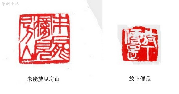 另外,陈师曾还有一些特別的印作,可看出其风格探索的痕迹。有某些印章与齐白石的印风较为接近,字法简约质直,章法从大处着眼,上疏下密,收放自如, 疏密对比强烈,只是线条仍然是双刀刻就,少了齐白石单刀直冲带来的霸悍之气,如『未能梦见房山』和『陈师曾所藏金石拓本』。因为没有边款,我们无从知道两方印的刊刻时间,也无从知道其和齐白石在印章方面 的影响关系,但可丰富我们对陈师曾印风的认识。陈氏还有几方章法很有个性的印作,如『放下便是』白文印 和一方『姚』朱文小印。『放下便是』印文文字排列紧凑,个別笔画作并笔处理,加上简黾的边残处理,造成 红白对比极为强烈,极具冲击力乂耐人品味。『姚』朱 文印把上疏下密做到了极致,印面文字集中靠上,下边大片留白,加上较宽的印边和连断巧妙安排,红白对比也极为强烈,给人以遐想。