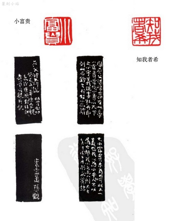 陈师曾篆刻作品刊刻边款较少,却独具特点。边款字数一般不多,仅有几方印刻长款,如『小富贵』 印,也有冷款,如『知我者希』一印边款仅有『朽作』 两字。