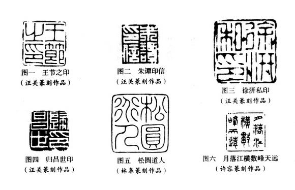 自明代中期到清代初期,篆刻艺术迅猛发展, 印人从最初治印时对刀法的茫然,到后来能够轻松 自如地控制刻刀,其间经历了一百余年的时间,篆刻艺术整体的风格也由粗疏、荒率发展到精雅、工稳。这一发展趋势是由篆刻较强的操作性决定的, 印人需在继承前辈经验的基础上,经长期的积累和 实践才能够做到裕如的运用刀法。晚明汪关的篆刻堪称这一发展趋势的代表,他已具备了超乎寻常的刀法控制能力。我们来看他仿汉魏朱文私印的『王节之印』(图一),仿汉白文私印的『朱谭印信』(图二)、『徐汧私印』 (图三),仿汉宫印的『归昌世印』(图四),以及继承圆朱文一路的『松圆道人』(图五)印,刀法稳健,笔画精美,章法工整,代表了当时印坛的主流风尚。