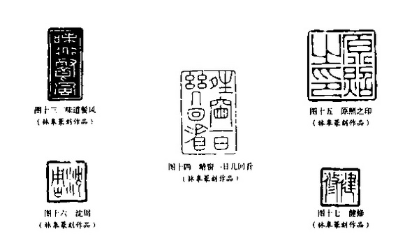 林皋的朱文印有三类:一是用小篆,沿袭宋元 圆朱文一路,如『晴窗一日几回看』 (图十四)印,章法疏落,篆法繁简适宜,雅妍之极,是林皋朱文印中最典型的风格,二是取法汉魏朱文私印,如『原照之印』(图十五),文用缪篆,转折以方,在笔画连 接处喜用『焊接点』。这类印虽明显受到汪关的影 响,但绝少汪关朱文印中常有的笔画粘连,可称不 谐时俗;三是所谓的宽边细朱文印,这类印在林皋 朱文印中占有很大的份额。这种形式本为战国古玺 所有,它上面的印文也应该使用大篆方易协调,但 明确这类印为战国时物,还是晚清的事,林皋不可 能知晓,而林皋却以敏锐的印章形式感,大量参用 小篆,章法上又时以错落为之,如「沈周」 (图十 六)、『健修』(图〕十七)诸印,精雅绝伦,为世人喜由上可知,林皋在继承上既全面又有选择性, 从刀法上看,其控制能力绝不在前辈大家汪关之 下,而是有过之而无不及,并且很少沾染吳时印坛 上的习气;另外,林皋又有内己的创新和贡献,他 取法汉凿印、战国古玺样式的印章最有自己的特 点,尤其是林氏的宽边细朱文印,已经形成朱文印 的一种固定格式,对后世有很大影响。