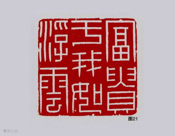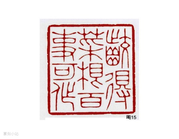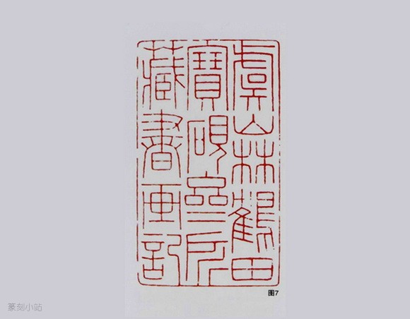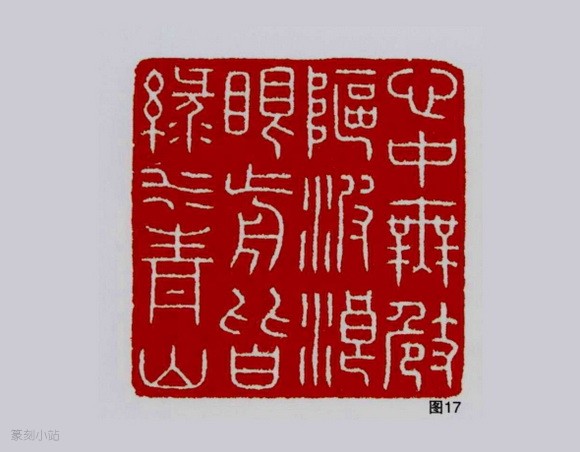 再如林皋“晴窗一日儿回看”印, 七个字中五个字是完全对称字形,“晴”之右、“看”字下部之目、上 部二向上弧线也都局部对称,法度森 严,功夫了得。章法则完全不间于“杏 花春雨江南”,占地随字形繁简精心 设计、周密处理。匀净光洁、平正秀丽 的铁线篆端庄大方,毫无板滞或雕琢 做作之感,每个篆字之间均无粘接, 虽字字独立,却气息贯通、疏密得当。