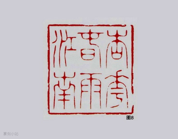 林皋的篆刻受苏州文彭、太仓汪 关父子、常熟本地沈世和等的影响和 启发,颇有心悟,时出新意。他所刻的 朱文印,转角圆润,纯净典雅。“杏花 春雨江南”一印,堪称林皋篆刻的代 表作。此句乃同屮佳句,境界柔美,令 人遐思,为历代艺术家们所赞赏,于 是,纷纷入画、入书、入印、入歌…… 它引发了无数文人的情感共鸣,拨动 了无数人珍藏在心灵深处的柔情,唤 起了长久思念的情愫和心境。林皋此 印风格虽近汪关细圆朱文“春水船” 一路,但没有停留在汪关平整精工的 创作层面,而是有创新提升。章法上, 落落大方安排“六等分”,分朱布白亭 匀妥帖。线条自然流畅、俏丽秀挺,刚 直屮带有弧意,显出线条的流动和张 力。点画交叉、衔接处看似漫不经意留下的“焊点”,与丝丝悬垂之笔自然 过渡,宛如春雨中的垂柳依依、杏花 点点。沪上韩天衡先生评价说:“观其 此作,篆刻洗练,章法稳贴,用冲刀f 于温穆中透露出挺峭的英迈之气。以 整件作品论,境界俏丽平和,贴切间 义,饶有文人治印的书卷气。”西泠印 社叶一苇先生评析:“假如用丁敬的 高古拙朴,就很难表现出杏花、春雨、江南这样的情景。而林皋的秀丽,却 托出了这个境界。”
