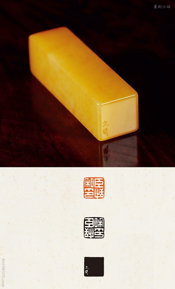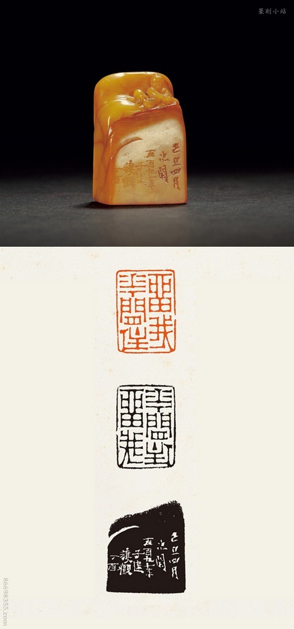 说明:赵之琛为嘉庆进士,兵部尚书卓秉恬所作“臣恬私印”白文姓名章,乃以一六面平田黄石佳材所刻,石重五十余克,裁切规整,色泽明丽,温润如脂,为印中至宝。印面仿汉式,方正生辣,以浙派典型切刀法出之,线条厚重有张力,气魄颇大。