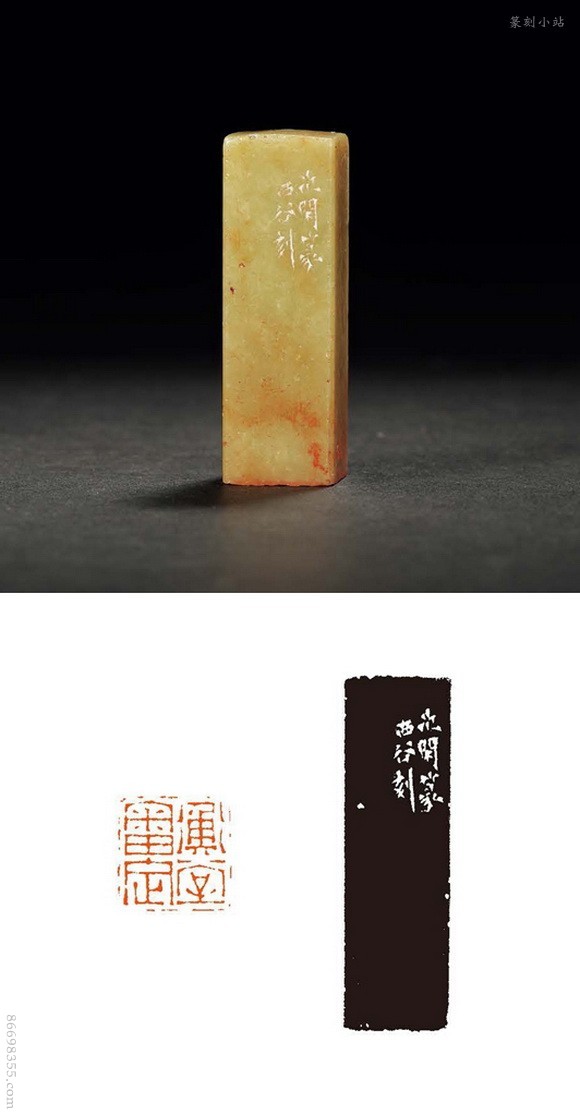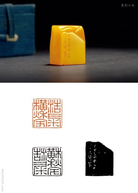 说明:此田黄石方章颜色明亮纯正,包浆浑厚,质地莹润、澄澈,宝光四溢。如此质地,更有此形制,实为田黄中之上品。“浩气横秋宇”语出自宋赵以夫词《龙山会》“九日无风雨。一笑凭高,浩气横秋宇。”贵比黄金的佳材与名家篆刻的完美结合,可谓是尽善尽美,当珍之宝之。