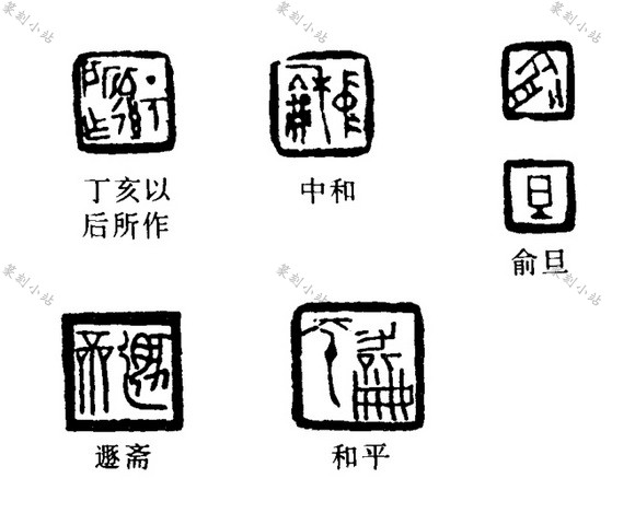 “丁亥以后所作”、“中和”两印的章法一茂密穿插、一疏朗简明,各异其趣。但用 刀大致相类,皆冲切相辅、运刀生涩。局部地方如并笔处,用刀含蓄不全部刻净,而 是故意模糊处理,令印章苍劲古朴,穆气森然。