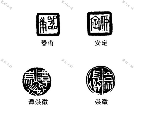 “器甫”、“安定”两印风格一方劲、一浑圆,一欹险、一工稳。用刀皆为冲法,且方 圆并用,婉转自然,只是在线条质感上器甫”一印刀法劲挺一些安定”一印刀法 浑朴一些。