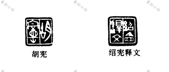 “胡宪”、“绍宪释文”两印属典型白文古玺样式。章法工稳大方、疏密因字而异。 篆法端庄合法,方圆兼顾。用刀含蓄凝练,冲刀所过处皆干净利落,不事修饰,令线 条秀逸之中蕴有劲挺之意。