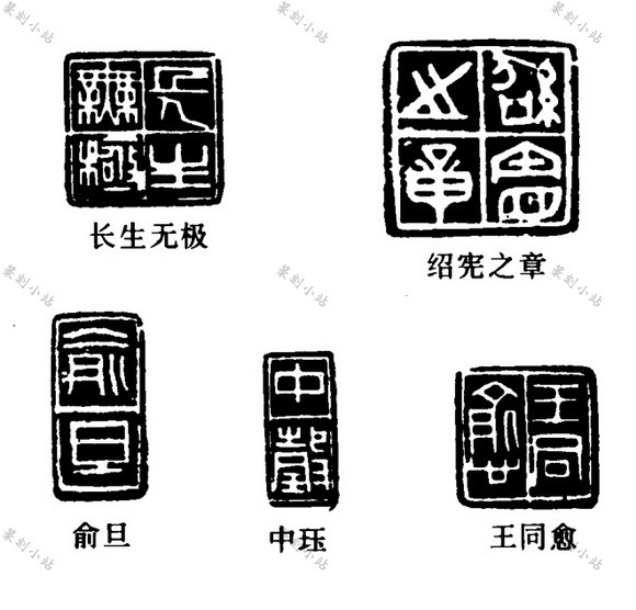 “长生无极”印有田字格,章法左密右疏,对比强烈,篆法方硬如诏版文字,斩钉 截铁。用刀时,刀角入石虽浅,但非常犀利快捷生”字较其他三字线条要粗厚一 些,乃因刀力较重所致。全印线条劲健鲠直,锋芒逼人。