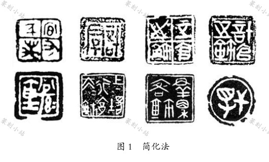 简化法。 楚玺文字简化方式多种多样, 有省略笔画、 减省偏旁、 共享同一部首等, 都是楚玺文字常用的简化法。“正官之鉨” 中的“官” 字,“宀”减省为“人”;“计官之鉨” 的“计”, 省掉了“言”上方的横画; 成语玺“宜有万千” 之“宜”, 省略了“且” 中部一画。 省略偏旁也较为常见, 楚私玺“干得” 之“得” 省掉了“彳 ”。 共享同一部首或部件的简化法颇具匠心, 楚私玺“计君子”之“君子” 采用上下合文法, 两字共一“口”;“公孙仓” 之“公孙”,上下合文, “公” 之下部构件被“孙” 之“子”部借用; 楚官玺“上场行邑大夫” 之“大夫”二字上下合文, 两字共一“大” 字。 简化法是楚系 文字在演化过程中的一种惯常用法, 楚玺之中 用得巧妙、 适当, 且不影响文字识读( 图 1)。