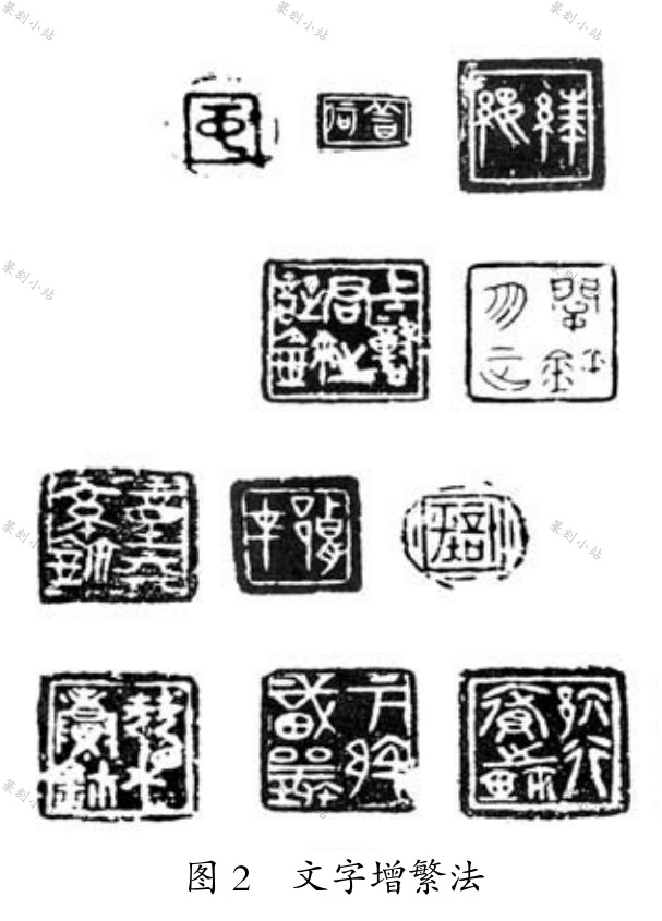增繁法。 文字趋于简化是先秦文字演变的总体趋势。 然而楚人在制作玺印时, 有时出于章法布局,或者美化结构的考虑, 往往采用整体或局部增繁的方法。 楚玺文字增繁大致有以下几种方式: 或在原文字基础上增加笔画, 或在原文字构造的基础上重复构件, 或增添新部首。 楚玺文字“平”、“中”、“可”、“上”、“下”、“正”、“长” 等字较为常见, 一般采用横上( 下) 加横的方法, 如楚玺“平阿”、“下蔡职襄”、“善何”、“勿征关鉨” 中的“平”、“下”、“可”、“正” 属于横上加横。 楚玺“中”、“中身” 之“中”是竖上加横( 有时加二横),“上场行邑大夫” 之“上”是横下加横,“絑 ” 之“絑” 下部加横。 楚私玺“胡才” 之“胡” 的“月 ” 部右上角加二小横,“才” 在竖画上加横。 楚私玺“张山”、“张鲁” 之“张”, 是在“长” 的顶部加横。 文字构件增繁主要是整体重复, 楚官玺“童其京( 亭) 鉨” 之“其” 字, 是两“其” 上下叠加,“尧相庚鉨” 之“尧” 字, 是两“尧”左右并列, 这都属于整体重复的繁化方式。 增添部首的繁化方式在楚玺中也较为常见。 如在“蔡”、“六”、 胡”、“朱” 等字旁加“邑”, 见于楚官玺“下蔡邑大夫”、“ 行府鉨”, 楚私玺“邾佗”、“胡才”等。 在“府” 下加“贝”, 见于楚官玺“大府”、“行府之鉨” 等。 在“中” 字上加“人”, 见于楚成语玺“忠信”。 在“平” 下加“土”, 见于楚玺“计平”( 图 2)。